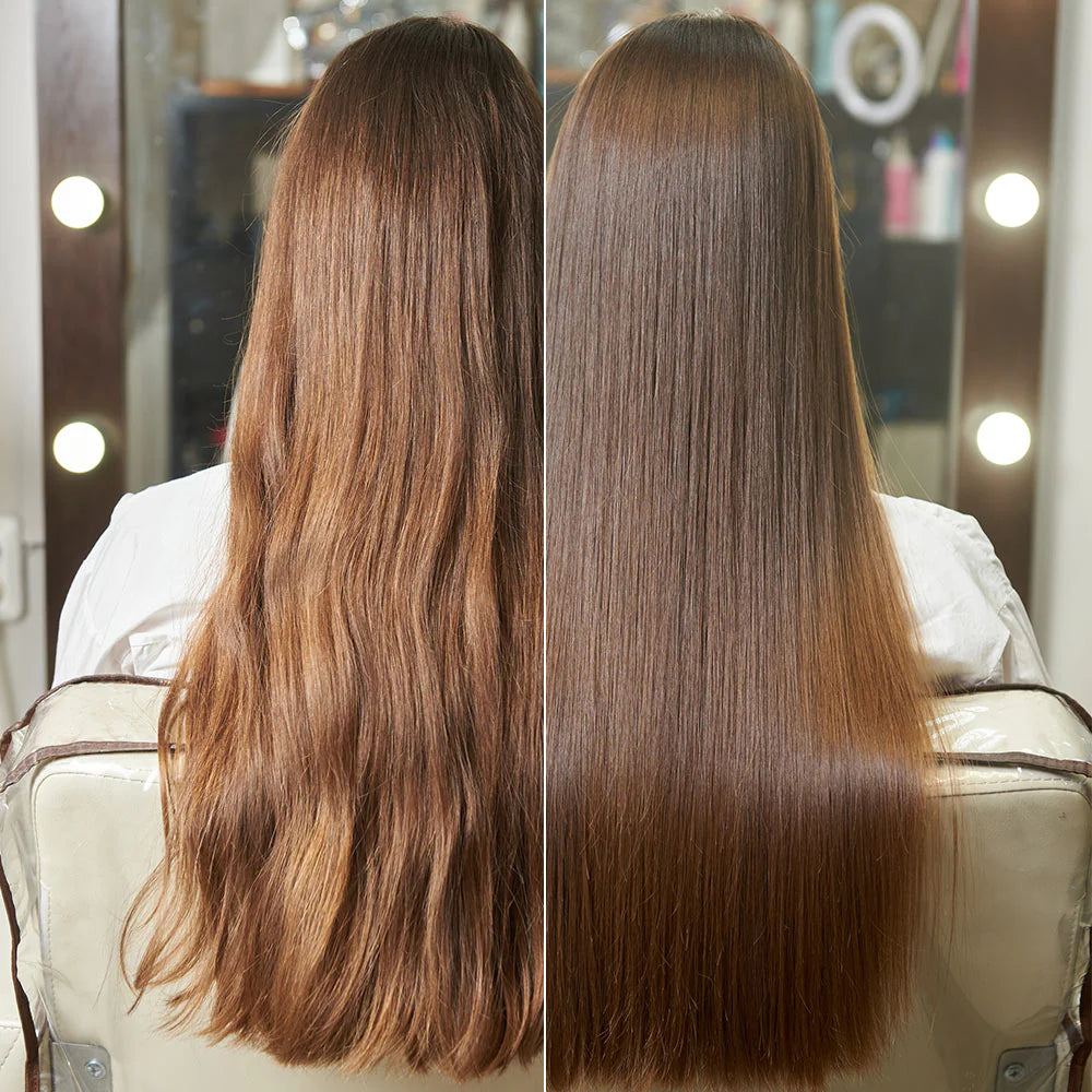 - Jau pēc pirmās lietošanas reizes mati iegūst tvirtumu, spīdumu, zīdainību un laminētu gludumu bez sausuma vai stinguma blakusefektiem.